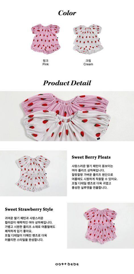 さらさらとした涼しいプリーツ生地の上に かわいいイチゴのパターンがちりばめられて